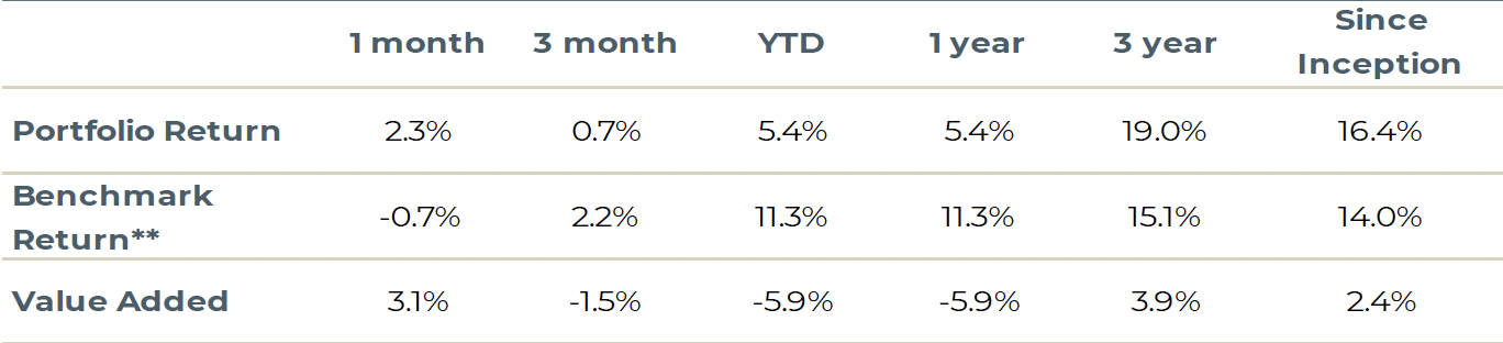 Inception of Fund is 27 June 2022. Performance numbers less than one year are cumulative while numbers greater than one year are annualized. Past performance is no guarantee of future results. **Benchmark is MSCI World Small Cap Net Index for all periods. Please note that the Benchmark from inception to September 22, 2023, was MSCI World Small Cap Index.