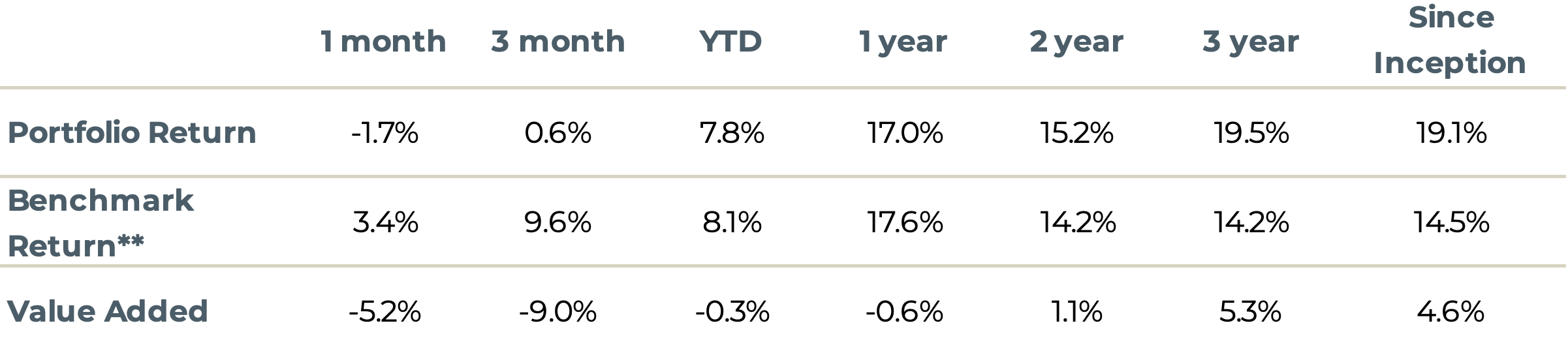 1Performance numbers as of 31 August 2025. Inception of Fund is 27 June 2022. Performance numbers less than one year are cumulative while numbers greater than one year are annualized. Past performance is no guarantee of future results. **Benchmark is MSCI World Small Cap Net Index for all periods. Please note that the Benchmark from inception to September 22, 2023, was MSCI World Small Cap Index.